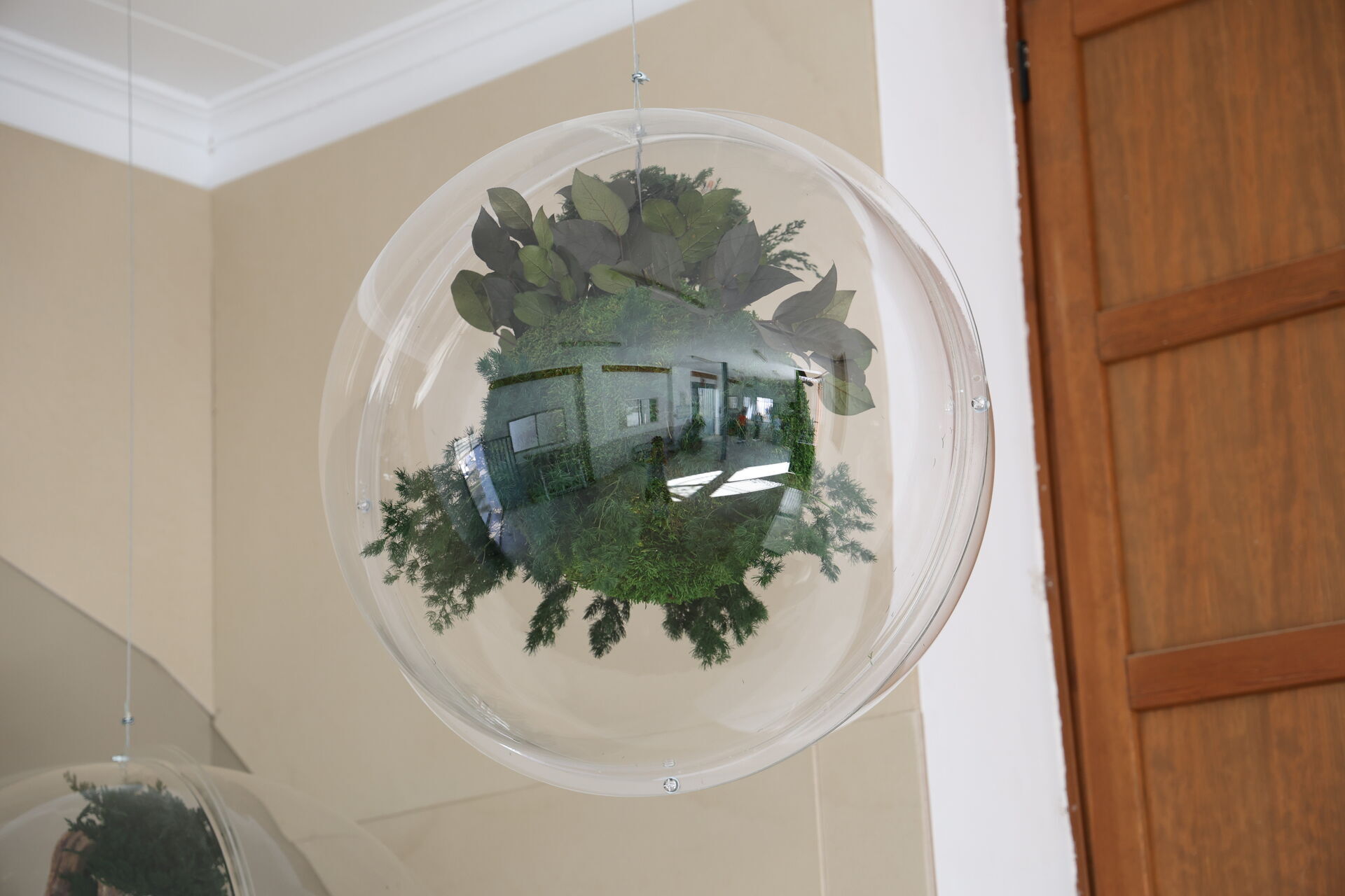 El “Rincón de la Memoria” se articula alrededor de una estructura de la que cuelgan dos esferas de metacrilato que protegen las esculturas. Estas, hechas a mano, recrean singulares planetas naturales con diferentes tipos de vegetación preservada, como musgos y plantas, que no necesitan riego ni mantenimiento para mantener su color, plasticidad y textura, como si estuvieran vivas.